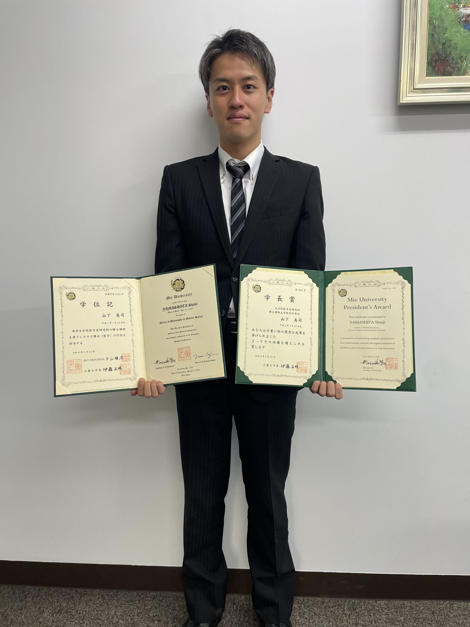 3月25日(水)学位記授与式が行われ、山下先生が学位記を授与し、また優れた研究活動の功績があった者として令和8年度三重大学学長賞(三重大学研究活動に関する表彰)も受賞いたしました。