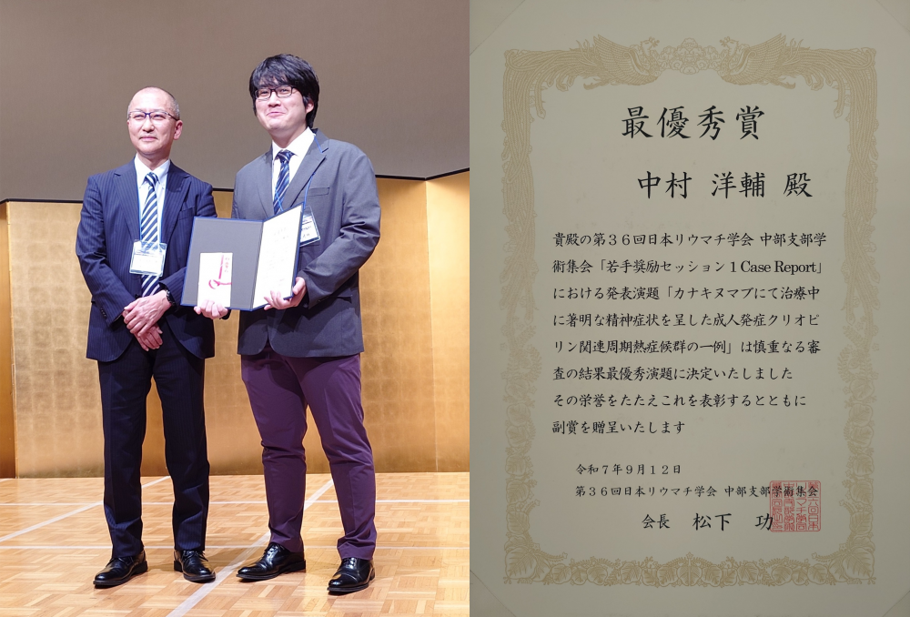第36回日本リウマチ学会中部支部学術集会で中村洋輔先生が、若手奨励セッションcase reportにて「最優秀賞」を獲得しました